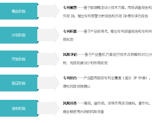 对于欲研发项目开展的预研性项目,可以通过配合项目管理的相关环节进行专利布局。比如:在概念阶段、计划阶段、开发阶段、验证上市阶段等不同环节开展不同的专利布局措施。