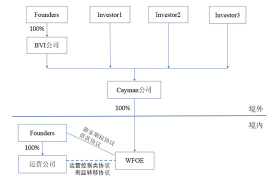 3、设立WFOE公司(Wholly Foreign Owned Enterprise;外商投资企业/外商独资企业)。主要是基于股息红利分配的考虑,避免中外股东潜在的利益冲突。当然,实践中也有开曼公司先在香港设立一个特殊目的公司,再由香港公司设立WFOE公司,主要是考虑到香港与大陆之间存在最优税收优惠协议,可以最大程度避税,节省公司成本。